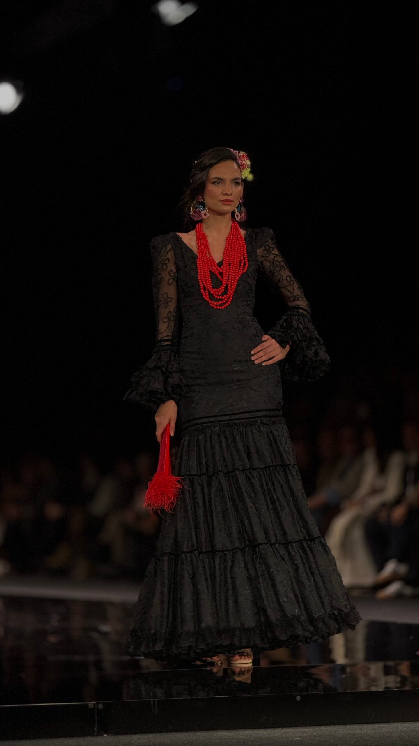El cierre llegó con una colección en negro, acompañada por La Tarara de fondo. Vestidos negros, algunos con lunares del mismo tono, abanicos con flecos y plumas, accesorios rojos y mantillas negras marcaron esta última parte. La mantilla fue el elemento elegido para cerrar el desfile. Al finalizar, Rosi de Palma apareció en la pasarela para entregarle el ramo a la diseñadora.