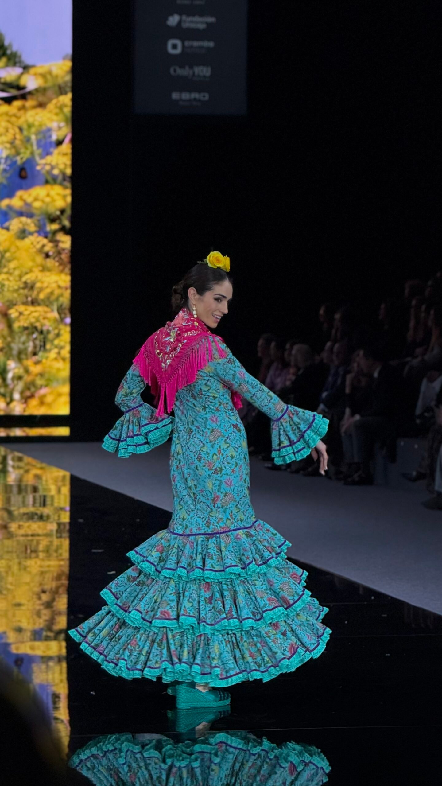 En la segunda parte, el color irrumpió con fuerza. Aparecieron combinaciones muy llamativas como lila con rojo, lila con rosa y un amarillo especialmente potente. A partir de este momento, los diseños comenzaron a alejarse de lo más clásico para dar paso a propuestas más creativas, tanto en el uso del color como en la colocación del mantón. Este bloque se cerró con un traje amarillo acompañado de un mantón del mismo tono decorado con flores coloridas.